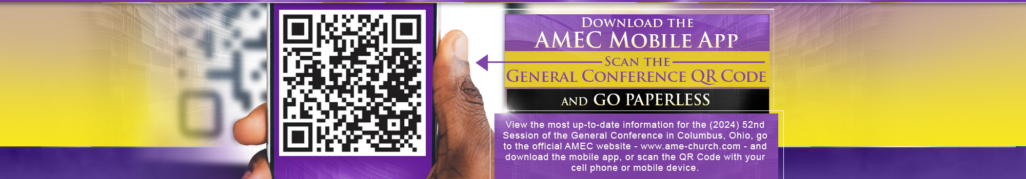 You may view the most up-to-date information regarding the 2024 General Conference on the AMEC Mobile app. Go to the official AMEC website: https://www.ame-church.com and download the mobile app. Also, you may scan the QR Code above.